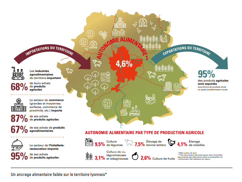 La Métropole de Lyon a pu faire évaluer en 2017 sa résilience alimentaire dans le cadre de sa stratégie alimentaire territoriale [6]. Le résultat est sans appel, similaire à d’autres métropoles : une autonomie très faible de l’ordre de 4,6% seulement des aliments consommés par les habitants. Il est à noter que le périmètre choisi est de 50 km autour de Lyon et que ces taux sont calculés en fonction de leur valeur (€).