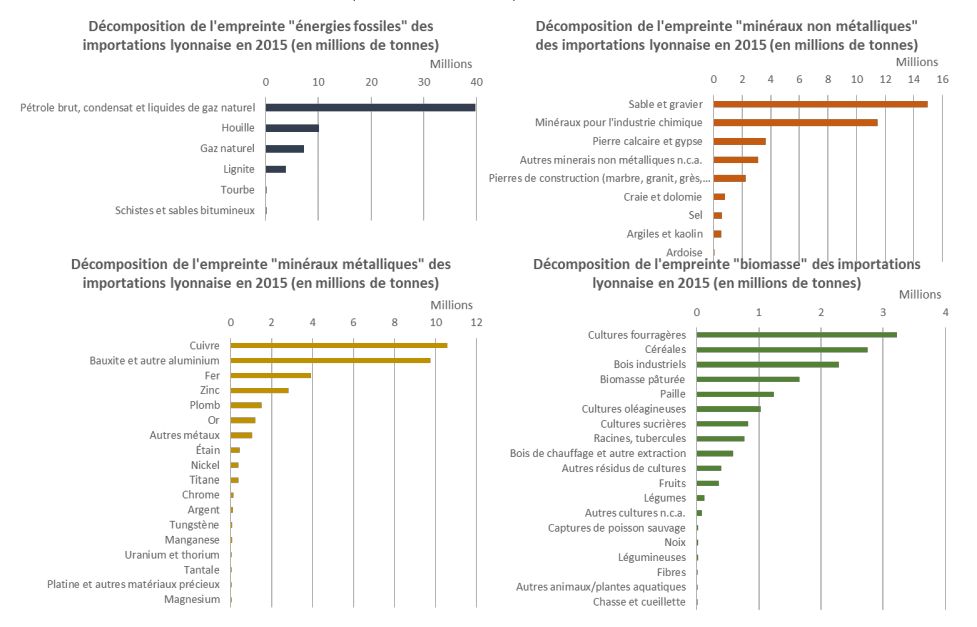 Parmi les 147 millions de tonnes importés, il y a aussi de nombreux métaux (cuivre, aluminium, fer, etc.) et minéraux non métalliques (sables, graviers, pierres, etc.), ainsi que de la biomasse (dont alimentaire) principalement dédiée aux ménages et déjà évoquée précédemment.