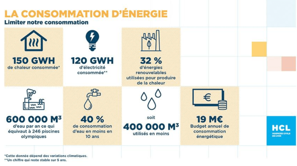 Quant à la continuité du service, elle est également pleinement dépendante des apports en énergie pour effectuer les interventions chirurgicales ou tout simplement alimenter les bâtiments, personnels et patients. Avant de rentrer dans le détail des consommations, on apprend dans le rapport des HCL [25] un engagement partenarial de réduction des émissions GES et notamment une volonté de réduire d’ici 2030 de 40% leurs consommations énergétiques.