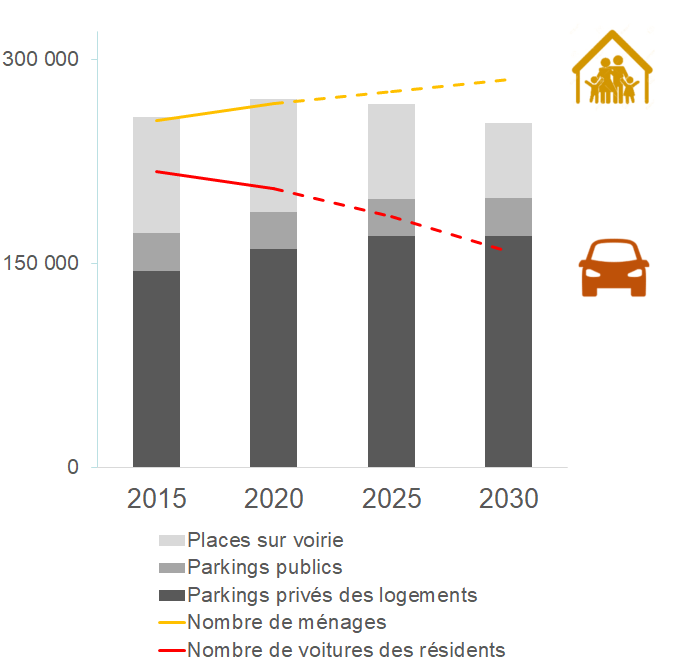 The graph above describes the prospective evolution of the parking supply between 2015 and 2030. The observation we can make today is that there is a very large supply of parking compared to the number of cars owned by the people of Lyon, allowing not only for the parking of all vehicles, but also for a good number of vehicles coming from outside the city. It should be noted, however, that the private car parks of companies are not included in the above graph, but do accommodate a significant proportion of vehicles coming from outside Lyon.