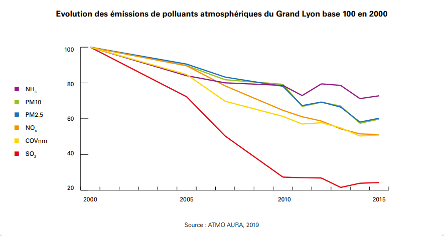 ATMO Auvergne Rhône Alpes shows in its 2019 report [6] that the trend of air pollution reduction is good over the last years.
