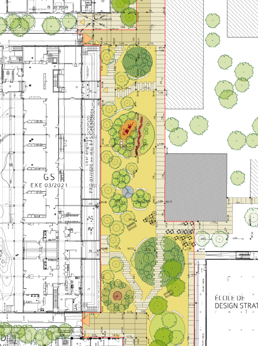 Lorsque nous affirmons notre volonté de revoir des enfants jouer dans la rue, cela passe par une telle organisation des flux pour garantir leur sécurité. Les flux automobiles seront faibles dans le « quartier du marché », ce qui facilitera l’usage des espaces publics par toutes et tous. Cela sera d’autant plus vrai qu’un nouveau groupe scolaire ouvrira à la rentrée 2023 dans le quartier. Conformément à notre programme de développement des « rues des enfants », nous avons décidé de créer un espace piéton végétalisé et ludique devant l’entrée: le chemin des écoliers. Cette extrémité sud de la rue Delandine sera perméable à 70% avec 111 arbres plantés et de nombreux arbustes entourant les divers mobiliers ludiques.