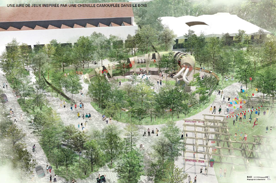 S’ajoute à cela la création du « Champ », un large espace vert d’un millier d’arbres et d’arbustes représentant plus de 7000 m² d’ombrage et une surface perméable à 75%. Le « champ » sera un espace fréquenté et apprécié par les habitantes et habitants. Dès 2024-2025, une grande aire de jeux verra le jour au sein du futur « champ ». En forme de chenille, elle sera un lieu de vie et de rencontre pour les nombreuses familles du quartier. Elle sera également particulièrement appréciée par les enfants, dénotant par rapport aux aires de jeux plus habituelles.
